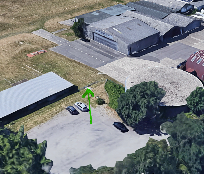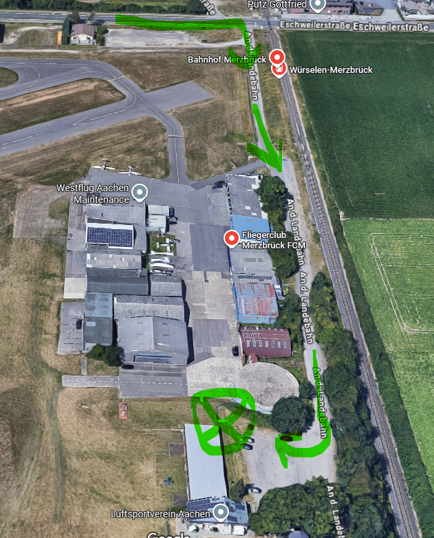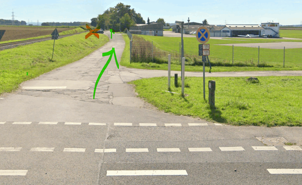 Folgen Sie nun bitte weiter dem Feldweg und fahren Sie am Parkplatz der Euregiobahn vorbei. Auf dem größeren Parkplatz können Sie dann irgendwo rechts parken. Am rechten Ende des Parkplatzes sehen Sie den Zugang zum Flugplatz.